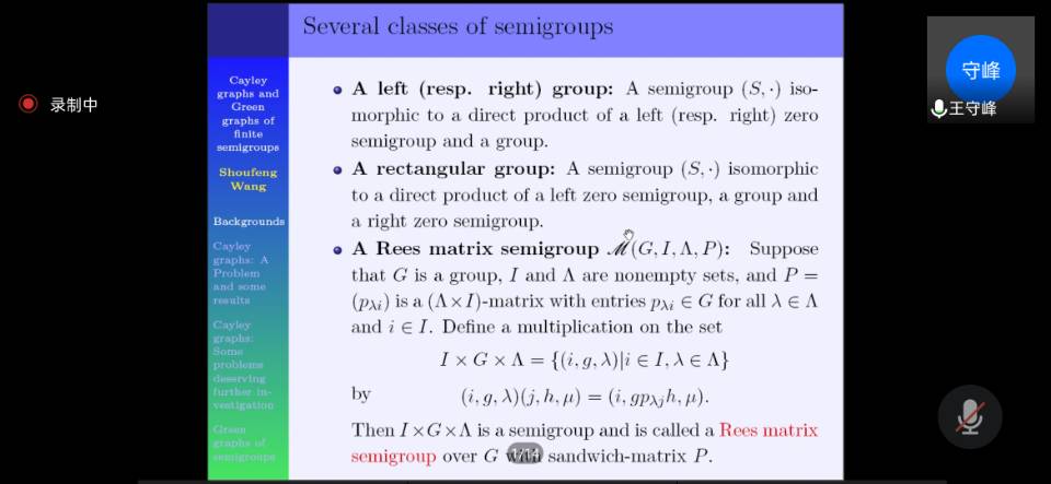 本次会议,共同围绕“突出原创——半群及相关领域发展”这一主题进行了深入研讨,分享交流半群及相关领域的新理论、新进展。西北大学赵宪钟教授,江西师范大学郭小江教授,湖北大学刘合国教授,华南理工大学周胜林教授等16位专家先后做报告,报告人以发表于《Advances in Mathematics》《Journal of Algebra》等重要学术期刊的成果为基础,就半群及其相关领域中的最新研究内容进行了广泛交流。每一个报告结束后,各位报告人就与会师生提出的相关问题作了解答。