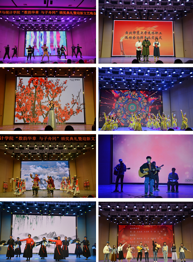 晚会以“数韵华章 与子舟同”为主题,伴乐诗朗诵《在一起》充分展示了全国人民在抗击新冠肺炎疫情中所形成的“生命至上,举国同心,舍生忘死,尊重科学,命运与共”的伟大抗疫精神;激情澎湃的乐队表演《生命因你而火热》《你都忘了你有多美》《你是人间四月天》,带观众走进了一个充满精彩和美好的生活世界;古风舞蹈《烟雨行舟》《雁归来》则将“凭栏孤伞舟前立,风吹杨柳细”和“浩气长存贯八面,傲气长存走四方”的古风古韵展现的淋漓尽致;现代舞蹈《Good boy》尽显数统学子多才多艺、风华正茂朝、气蓬勃的精神风貌;维吾尔族舞蹈《那孜库姆》、苗族和藏族舞蹈串烧《民族舞魂》、苏丹职工舞蹈《Sudan culture》充分展现了民族团结、睦邻友好的家国情怀;独唱《红梅赞》、合唱《“星”的甜蜜》、歌曲串烧《乘风破浪》更是将晚会推向高潮;小品《火炬手》、话剧《皇帝与刺客》、相声《调侃》引得观众爆笑不断、掌声阵阵。最后,晚会在师生共同演唱的歌曲串烧《来日纵是千千晚星》中圆满落下帷幕。