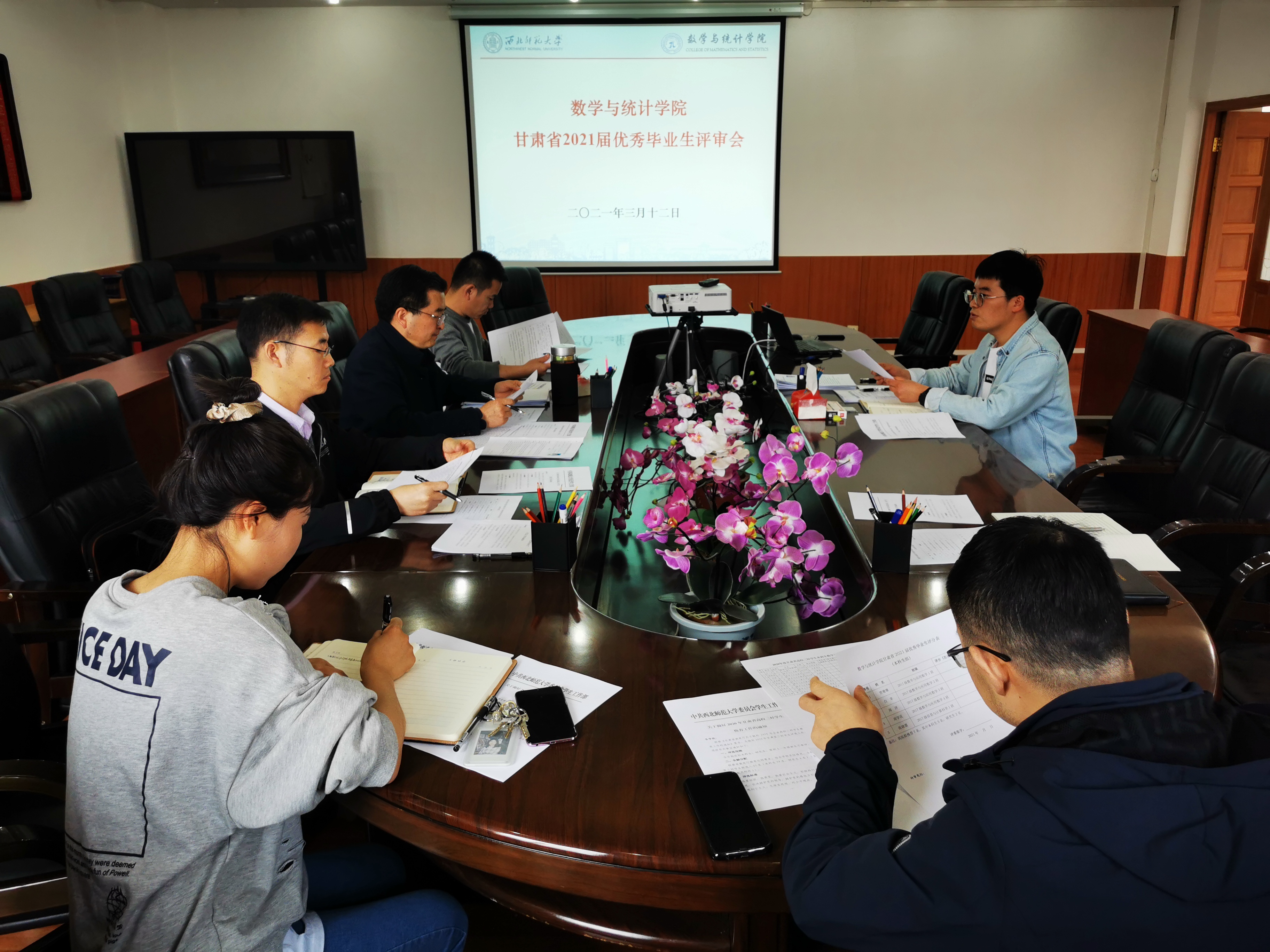 会议分两部分举行,首先进行甘肃省2021届优秀毕业生评审会,评委根据文件要求,认真审阅毕业班等额推荐的员工资料,一致认为贾珊珊等7位同学符合甘肃省优秀毕业生的要求,同意推荐。