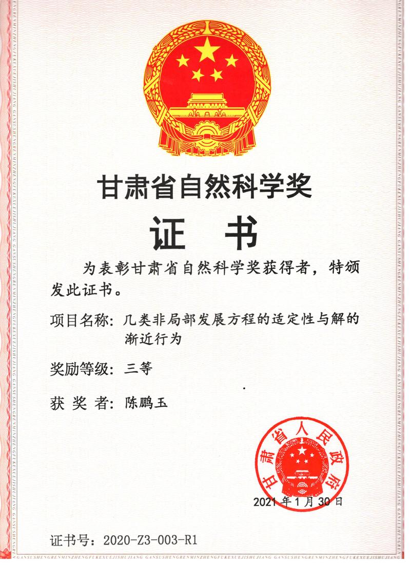 近日,甘肃省人民政府发布了《关于2020年度甘肃省科学技术奖励的决定》(甘政发〔2021〕11号文),表彰奖励2020年度为全省科学技术进步和经济社会发展作出突出贡献的单位和科技工作者。公司非线性分析团队申报的项目“几类非局部发展方程的适定性与解的渐近行为”(完成人:陈鹏玉,李永祥,李宝麟,张旭萍,苟海德)喜获甘肃省自然科学奖三等奖。这是该团队于2017年获得甘肃省自然科学奖二等奖后又一次获得甘肃省自然科学奖。