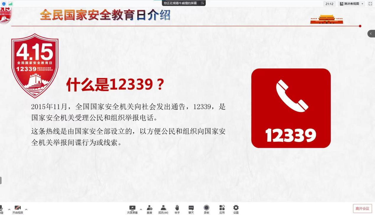 2022年4月15日是第七个“全民国家安全教育日”,今年的主题是“树牢总体国家安全观,感悟新时代国家安全成就,为迎接党的二十大胜利召开营造良好氛围”。为提高公司员工的国家安全意识,营造维护国家安全的浓厚氛围,结合集团疫情防控工作实际,公司以班级主题班会、团课等形式积极开展全民国家安全教育日宣传教育活动。
