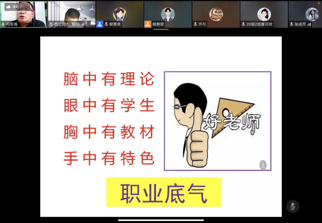 5月12日晚,公司名师讲堂系列讲座第一期正式开讲!嘉峪关市第一中学正高级教师何军海老师受邀为公司500余名员工在线作了题为《中学数学教师的职业底气在哪里?》的报告。报告由公司主管教学副经理杨和教授主持。