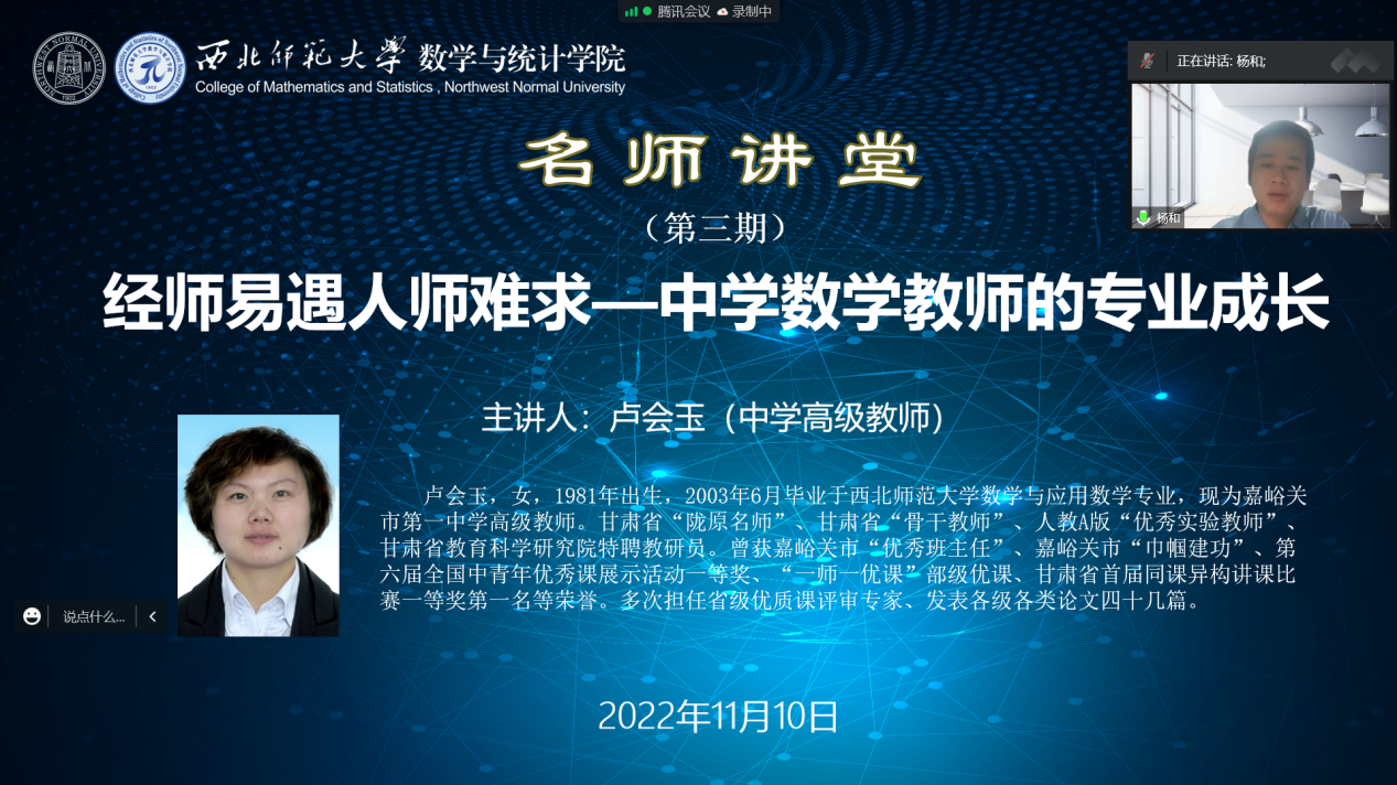 11月10日晚,公司在线上举办名师讲堂第三期讲座。讲座邀请“陇原名师”卢会玉作了题为“经师易遇人师难求:中学数学教师的专业成长”的报告,讲座由公司副经理杨和教授主持,共计300余人参加了此次讲座。