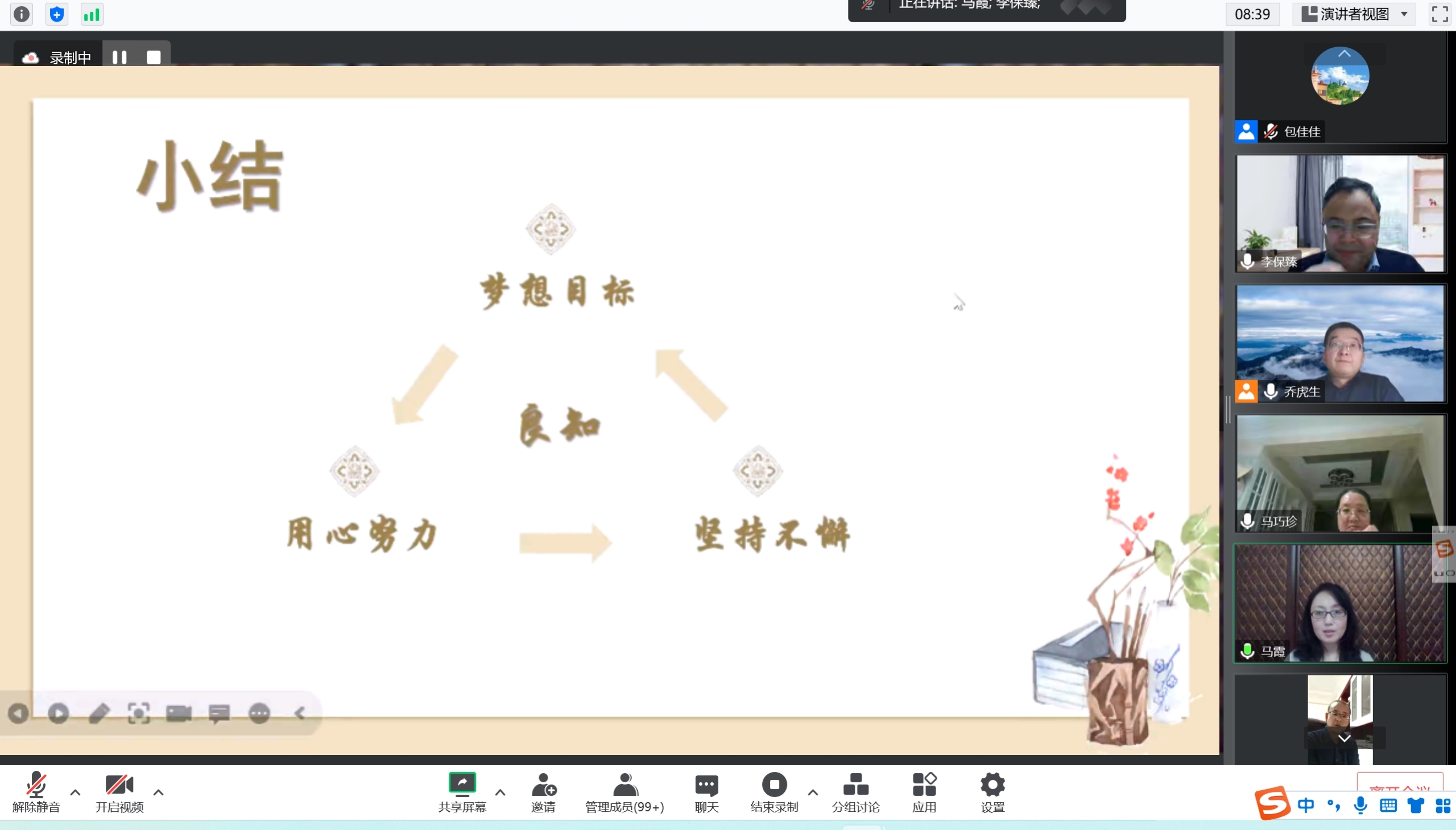 马霞总经理生动又详细地讲述了儿时的梦想、老员工活和工作经历三部分的经历及感悟。她勉励员工,第一,“技多不压身”。当代老员工在成长过程中要努力学习多领域、多学科的知识与技能,不断充实自己。第二,“事因知足心常乐”。无论在顺境还是在逆境中,调整好心态,做好自己能做的。第三,“学海无涯苦作舟”。求学道路上充满荆棘,但仍然需要不服输、不气馁的勇气与担当。第四,“百般红紫共芳菲”。不问前程,只管耕耘,人生不同的经历终究会造就自己。第五,“用舍在时,行藏在我”。一个时代有一个时代的机遇,一个人有一个人的穷通,并非每个人都能在时代的浪潮有所成就,但是一个人应该有坚定的生活原则,自己权衡处世。