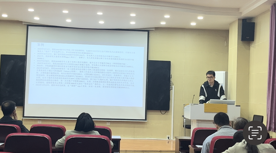 会上,负责防范电信诈骗工作的辅导员就公司近年来发生的案例进行了详细的解读,总结了在校园内常见的几类电信诈骗手段和防范的要点及方法,要求各班级班主任要督促、监督本班员工下载并安装“国家反诈中心app”、注册金钟罩,做好防范电信诈骗宣传教育,切实保护好员工的“钱袋子”。