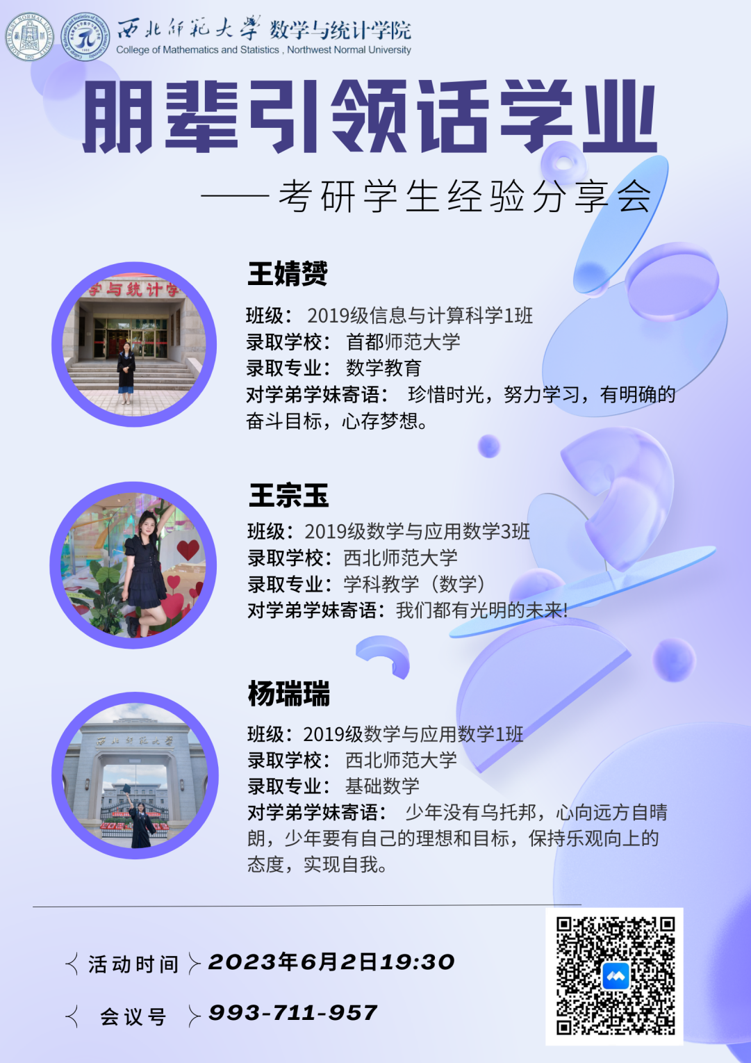 为增强员工学习主动性,充分发挥榜样引领示范作用,公司于6月2日19:30举办线上“朋辈引领话学业——考研员工经验分享会”系列活动第三期,本期邀请2019级信息与计算科学1班王婧赟、2019级数学与应用数学3班王宗玉、2019级数学与应用数学1班杨瑞瑞三位同学进行考研经验分享,会议由辅导员包佳佳主持。
