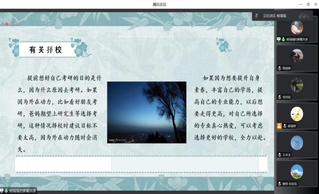 杨瑞瑞同学从目标院校选择,信息收集以及备考经验三个方面进行分享,同时介绍了各类考研公众号、学习App等,鼓励大家“但行己路,莫问前程”,做好自己该做的事,明确目标就全力以赴,不要瞻前顾后,备考期间不要总和别人比进度,按照自己的节奏走!