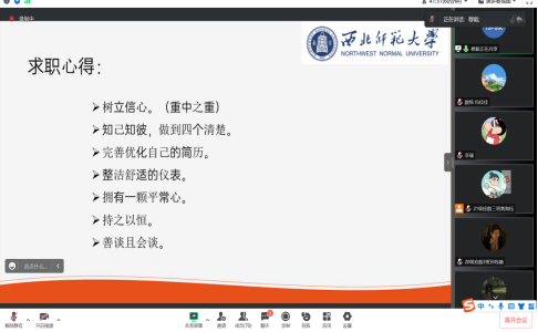 苏怡同学围绕明确自己的目标、有的放矢地制作简历、表现出自己的优势,扬长避短和适时总结四个方面分享了自己的求职经历,为学弟学妹们将来求职提供了宝贵经验。