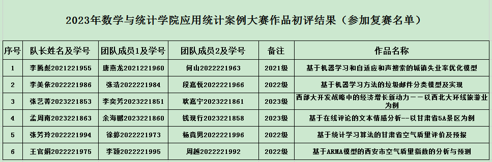 公司应用统计专业37名硕士研究生组成了13支队伍参加了本次应用统计案例大赛。由肖鸿民教授、冯慧芳教授、冯德成副教授、杨宏副教授、温瑾副教授、乔军胜教授、田玉柱副教授、张建东老师组成了本次案例比赛组织委员会,负责大赛的评审工作。比赛分为初赛和复赛两个阶段。