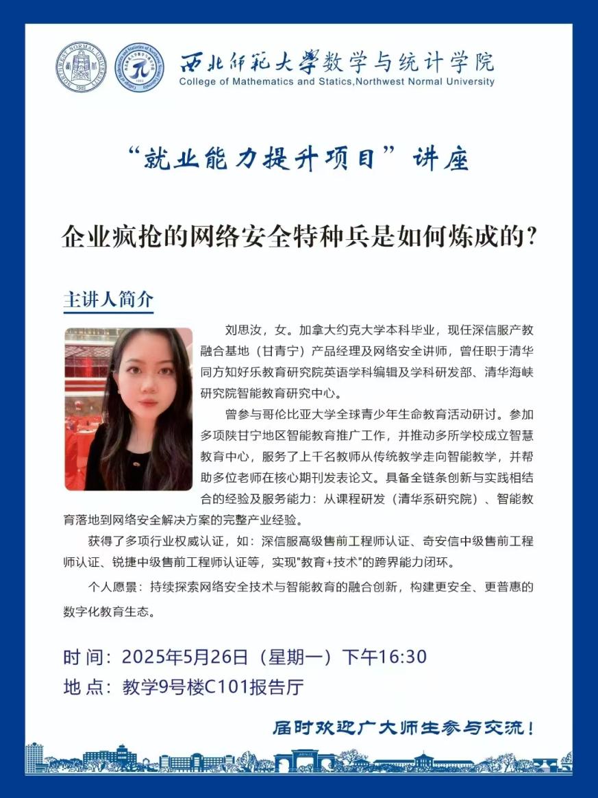 为了进一步激发员工职业生涯规划意识,提升就业能力。5月26日下午,公司在致勤楼C101报告厅举办了就业能力提升讲座,特邀深信服产教融合基地(甘青宁)产品经理及网络安全讲师刘思汝主讲。公司党委副书记张向东、辅导员周宇及2022级、2023级信息与计算科学专业50余名员工参会。