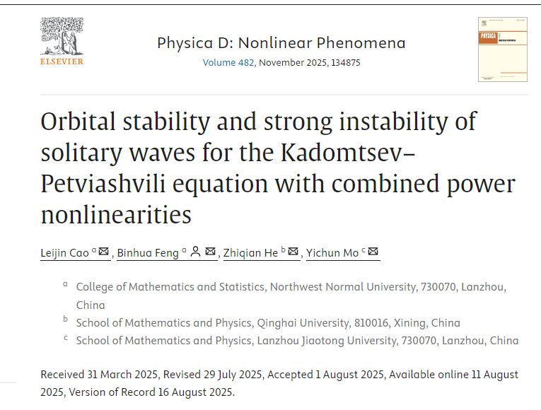 近日,公司冯斌华教授与2023级博士生曹磊金及其合作者在国际权威期刊《Physica D: Nonlinear Phenomena》上发表了题为 “Orbital stability and strong instability of solitary waves for the Kadomtsev-Petviashvili equation with combined power nonlinearities” 的高水平学术论文(论文链接:https://doi.org/10.1016/j.physd.2025.134875),这是我院首次以第一署名单位在该刊物上发表学术论文,也是公司近年来推行高质量培养研究生系列举措取得成效的具体体现。《Physica D: Nonlinear Phenomena》由国际知名出版社Elsevier 出版,其发文主题深刻聚焦于非线性现象的基础数学与物理原理,广泛涵盖波动、模式形成、混沌及复杂系统等多个核心前沿领域,是数学物理方向认可度极高的学术期刊,同时也是中国数学会数学领域高质量科技期刊分级目录中的T2类刊物。