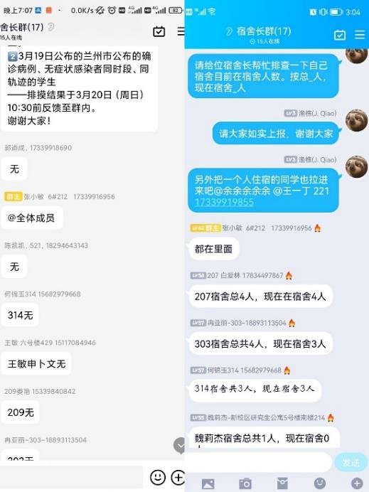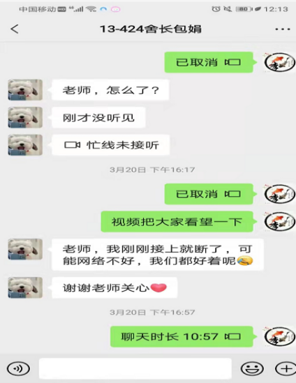 “时空里不能和员工见面交流,那就在‘云端’见面和交流吧。”2018级数学与应用数学3班班主任李晓燕老师与员工们温暖相守,“我真觉得员工就像自己的孩子,封闭管理期间见不到还想呢,所以和在校的每个宿舍每位同学都进行了视频交流,当看到他们脸上的笑容时,我心里也是格外开心。”李老师对于有困惑和困难的员工,通过“云端”给予及时帮助,比如有位同学某天晚上给发信息说她出疹子了买不到药,李老师立即和辅导员联系,按着正常程序让员工顺利就医。