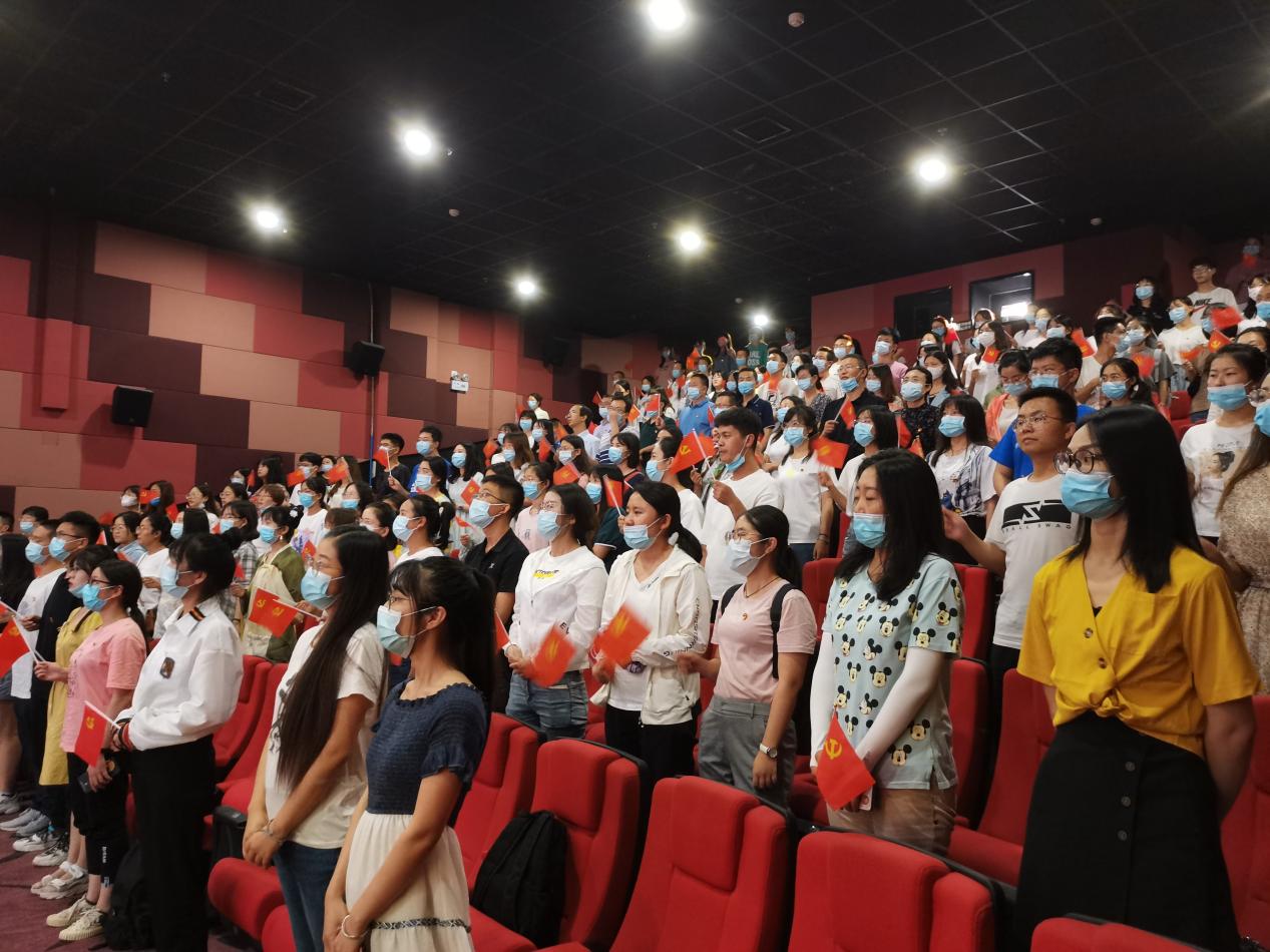 观影结束后,大家挥舞着手中鲜红的党旗,齐声歌唱《没有共产党就没有新中国》。